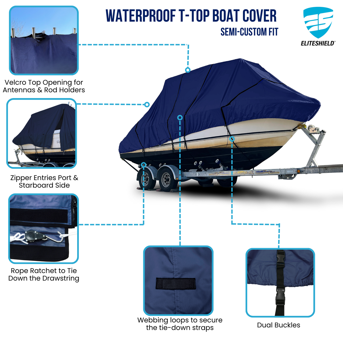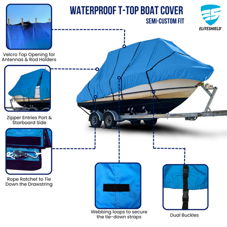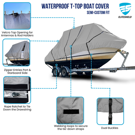 The EliteShield ProShield™ 600D Hard Top/ T-Top Boat Cover delivers superior all-weather protection, keeping your boat safe from sun, rain, snow, dirt, and pollutants whether on a trailer or at the dock.